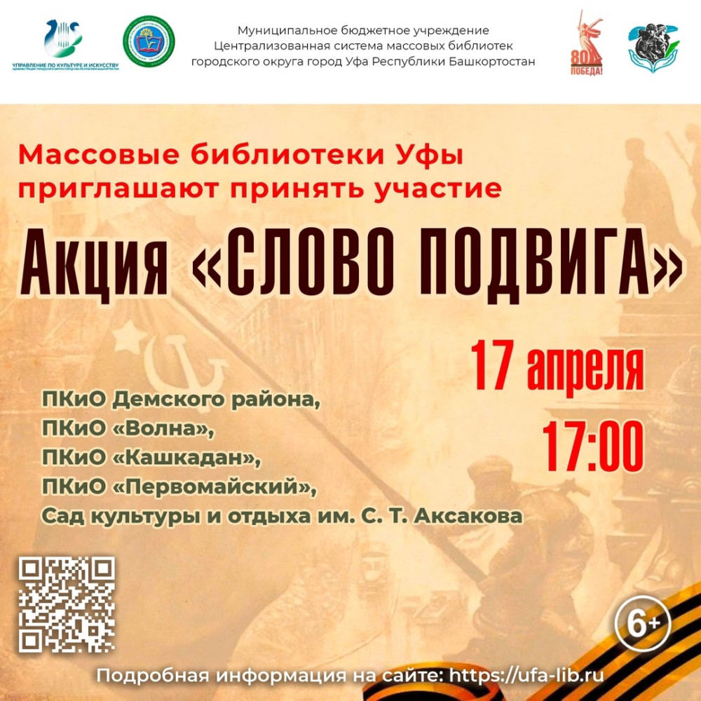 Акция «Слово подвига» Массовые библиотеки Уфы приглашают вас принять участие в акции «Слово подвига», приуроченной к 80-летию Великой Победы и Году защитника Отечества в России. Это событие объединит литературу и патриотизм. В рамках акции участники смогут погрузиться в атмосферу военных лет через стихи известных поэтов: Александра Твардовского, Ольги Берггольц, Константина Симонова и других. Чтение стихов на тему подвига и героизма на открытых площадках города позволит каждому выразить свое уважение к подвигу предков и почувствовать себя частью общей истории. Присоединиться к акции может каждый, независимо от возраста и уровня подготовки. Главное — желание отдать дань уважения павшим героям. Дата проведения: 17 апреля. Место проведения: Эта акция — отличный способ объединить усилия ради сохранения исторической памяти и передать эстафету героизма будущим поколениям.