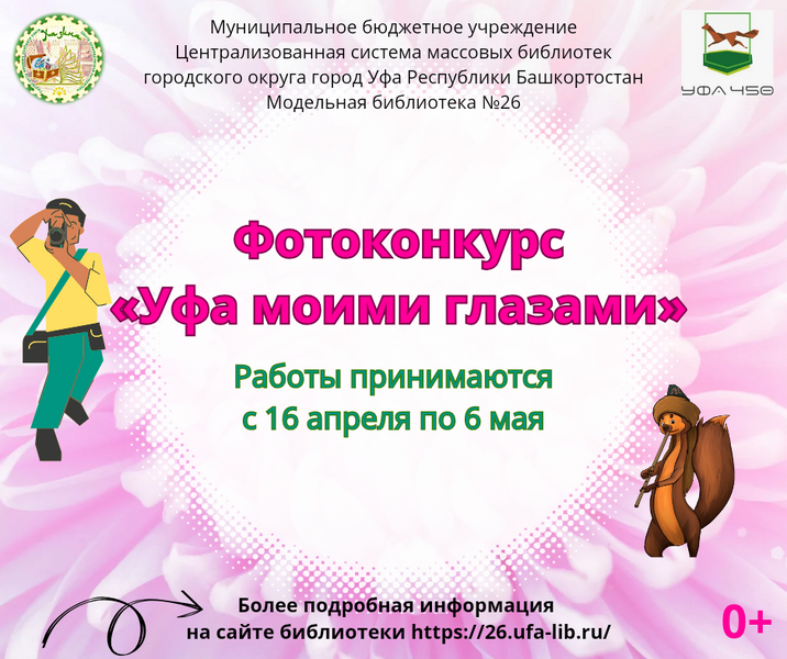 Фотоконкурс «Уфа моими глазами» приглашает к участиюС 16 апреля по 21 мая 2024 года проходит фотоконкурс «Уфа моими глазами», посвященный 450-летию г.Уфы. Его участником может стать любой желающий вне зависимости от возраста и местонахождения. Организатором конкурса выступает Модельная библиотека № 26 – Центр краеведческой литературы «Хазина» МБУ ЦСМБ ГО г. Уфа РБ. Цель конкурса – формирование представления о богатстве культурно-исторических памятников города и позитивного имиджа города Уфа, отражение общественной и культурной жизни города, посредством фотографии, повышение престижа библиотеки. На конкурс принимаются фотографии формата jpg, размер не более 20 Мб, отражающие кадры родного города и жизнь в нём: парки и скверы, родные улицы и достопримечательности столицы. Конкурс проходит в 2 этапа - прием заявок и работ и голосование. Заявку на участие и работу необходимо отправить с 16 апреля по 6 мая по ссылке https://26.ufa-lib.ru/konkursy. Крайний день приема заявок и работ 6 мая до 17:00 часов по московскому времени. Голосование за лучшую работу пройдет с 8 по 20 мая на официальном сайте библиотеки-организатора https://26.ufa-lib.ru/. Завершение голосования 20 мая в 17:00 часов по московскому времени. Итоги фотоконкурса будут подведены 21 мая на официальном сайте библиотеки-организатора https://26.ufa-lib.ru/ и в официальных группах социальной сети ВКонтакте https://vk.com/biblio26_ufa и Одноклассники https://ok.ru/group/70000000315399. Победители станут обладателями электронных именных дипломов, все участники получат сертификаты. Подробная информация о конкурсе представлена по ссылке. Приглашаем всех желающих принять участие в конкурсе! |