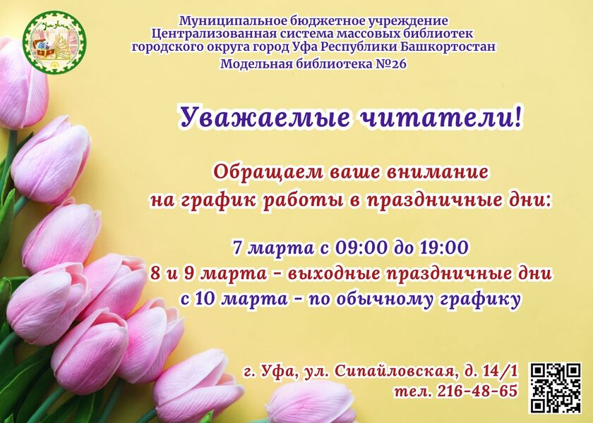 Обращаем ваше внимание на изменение графика работы Модельной библиотеки №26 г. Уфы в праздничные дни, посвященные Международному женскому дню - 8 Марта.