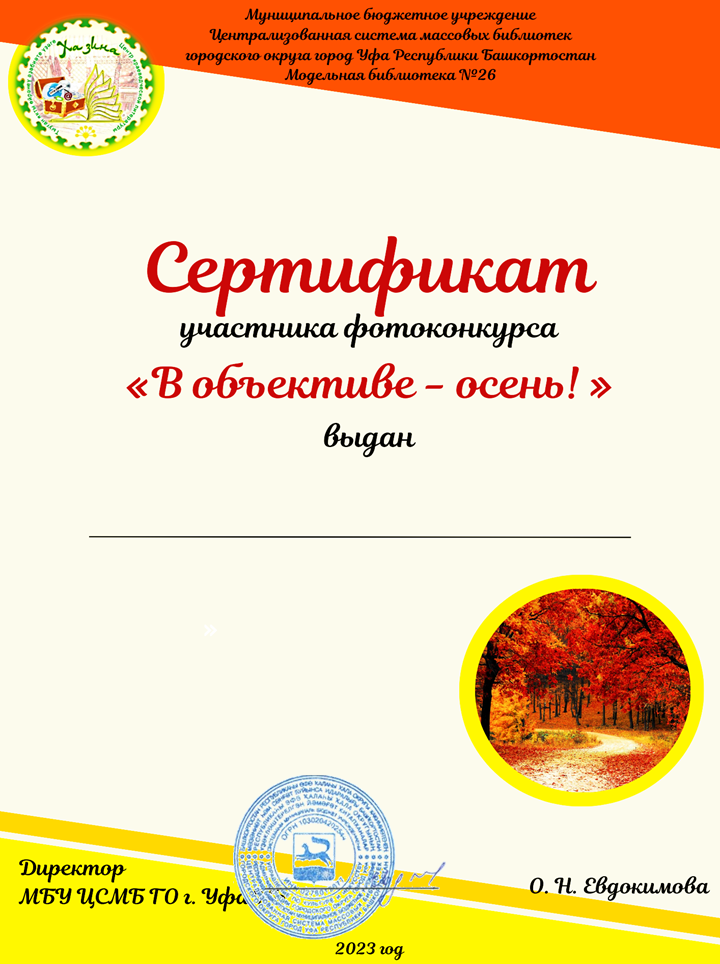 Итоги фотоконкурса «В объективе – осень!»Модельная библиотека №26 определила победителей фотоконкурса «В объективе – осень!». Конкурс проходил с 10 ноября по 9 декабря 2023 года. Голосование конкурса проходило на официальном сайте Модельной библиотеки №26 МБУ ЦСМБ ГО г. Уфа РБ https://26.ufa-lib.ru/ с 29 ноября по 8 декабря 2023 года. Сегодня, 9 декабря мы определили победителей и объявляем их имена! Победителями фотоконкурса «В объективе – осень!» стали: 1 место - Добышева Елена Семёновна, «Берёзы жёлтою резьбой блестят в лазури голубой», Омская область, р. п. Шербакуль. 2 место – Красильникова Ирина Анатольевна, «Отдых на озере Теренкуль», Челябинская область, Сосоновский район, пос. Мирный. 3 место - Коленченко Григорий Валерьевич, «Закружилась в книгах осень» Белгородская область г. Белгород. Победителям будут высланы именные дипломы. Все участники награждаются электронным сертификатом, который можно скачать здесь. Благодарим всех участников, принявших активное участие в нашем конкурсе! Следите за анонсами и участвуйте в наших последующих конкурсах!