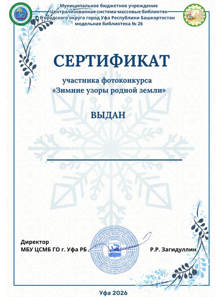 Итоги голосования фотоконкурса«Зимние узоры родной земли»!Итоги голосования фотоконкурса «Зимние узоры родной земли»!!! Конкурс проходил с 6 по 20 февраля 2026 года. В фотоконкурсе «Зимние узоры родной земли» победителями стали: 1 место: Маркина Любовь с фотоработой «Зимние пейзажи моего родного края» 2 место: Кадулин Александр с фотоработой «Зима» 3 место: Лавлинская Маргарита с фотоработой «Зимние красоты родного села» Голосование конкурса проходило на официальном сайте Модельной библиотеки №26 МБУ ЦСМБ ГО г. Уфа РБ 26.ufa-lib.ru/ Всех остальных участников благодарим за участие! Сертификат самостоятельно можно скачать здесь |
