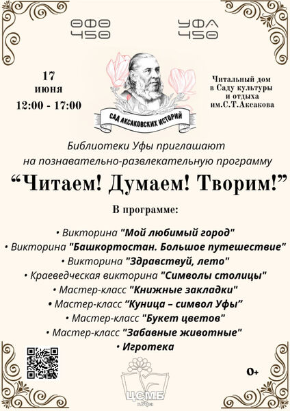 - Викторина «Башкортостан. Большое путешествие»; - Викторина «Здравствуй, лето»; - Краеведческая викторина «Символы столицы»; - Мастер-класс «Книжные закладки»; - Мастер-класс «Куница - символ Уфы»; - Мастер-класс «Букет цветов»; - Мастер-класс «Забавные животные».