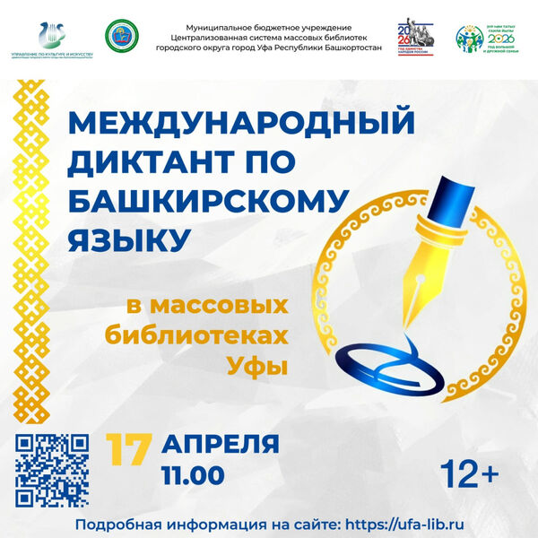 Международный диктант по башкирскому языку - 2026пройдет в массовых библиотеках Уфы17 апреля 2026 года состоится образовательная акция «Международный диктант по башкирскому языку - 2026». Диктант пройдет в онлайн и офлайн форматах.
