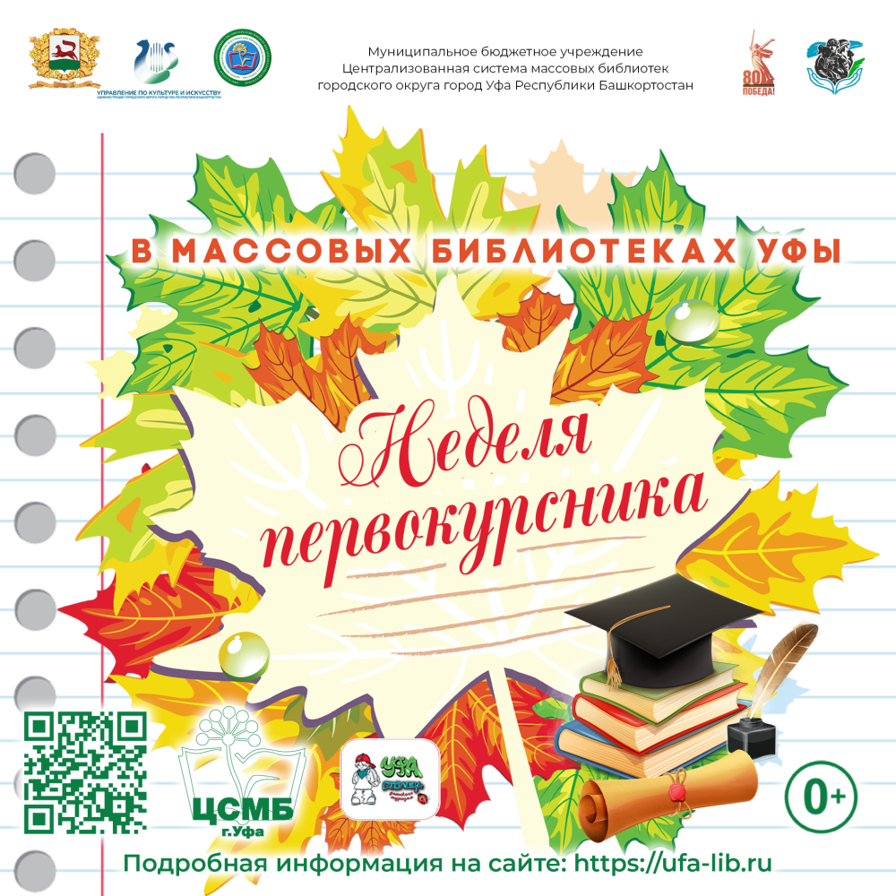 16.09.2025 в 12:00 Экскурсия по библиотеке «Библиотека приглашает!». Место проведения: Библиотека № 8 (г. Уфа, ул. Достоевского, 160); 16.09-19.09.2025 с 11:00 до 18:00 Неделя первокурсника «Студенческий Библиостарт». Место проведения: Центральная городская библиотека (г. Уфа, ул. Комсомольская, 138); 16.09-19.09.2025 с 11:00 до 20:00 Презентация книжной выставки «Этика деловых отношений». Место проведения: Модельная библиотека № 2 (г. Уфа, ул. З. Биишевой, 15); 16.09-19.09.2025 с 11:00 до 20:00 День открытых дверей «Лестница успеха начинается здесь». Место проведения: Модельная библиотека № 2 (г. Уфа, ул. З. Биишевой, 15); 17.09.2025 с 09:00 до 20:00 День информации «Мир знаний открывает книга». Место проведения: Модельная библиотека № 32 (г. Уфа, ул. Ферина, 14); 17.09.2025 в 10:00 Экскурсия по библиотеке «Мир знаний открыт для вас». Место проведения: Библиотека № 1 (г. Уфа, ул. Шафиева, 6); 17.09.2025 в 14:00 Час общения «Для вас, первокурсники!». Место проведения: Модельная библиотека № 26 (г. Уфа, ул. Сипайловская, 14/1); 18.09.2025 в 12:00 Экскурсия по библиотеке «И вот уж более ста лет библиотечный льется свет». Место проведения: Библиотека № 5 (г. Уфа, ул. Карла Маркса, 64); 18.09.2025 в 12:00 Информационный час «Мы – студенты!» Место проведения: Модельная библиотека № 6 (г. Уфа, ул. Революционная, 165); 18.09.2025 в 12:00 Информационный час «Библиотека - будущему студенту». Место проведения: Библиотека № 8 (г. Уфа, ул. Достоевского, 160); 18.09.2025 в 12:00 Молодёжный библиококтейль «Библиотека: современные способы получения информации». Место проведения: Библиотека № 15 (г. Уфа, ул. Ю. Гагарина, 37/1); 18.09.2025 в 13:00 Познавательно-игровая программа «Студенчество – весёлая пора». Место проведения: Библиотека № 49 (г. Уфа, ул. Б. Хмельницкого, 92); 18.09.2025 в 14:00 Экскурсия «Модельная библиотека - новые возможности». Место проведения: Модельная библиотека № 20 (г. Уфа, ул. Акназарова, 24); 18.09.2025 в 15:00 Библиотечно-библиографический урок «Собиратели земли Русской: презентация серии книг». Место проведения: Модельная библиотека № 32 (г. Уфа, ул. Ферина, 14); 19.09.2025 в 11:00 Познавательный час «Книжная планета». Место проведения: Модельная библиотека № 29 (г. Уфа, проспект Октября, 97/1); 19.09.2025 в 12:00 Интеллектуально-игровой квиз «Студенческий калейдоскоп». Место проведения: Модельная библиотека № 32 (г. Уфа, ул. Ферина, 14); 19.09.2025 в 13:00 Час общения «День студента». Место проведения: Библиотека № 23 (г. Уфа, бульвар Хадии Давлетшиной, 19/1); 19.09.2025 в 14:00 Информационный час «Библиотека – открытый мир идей». Место проведения: Библиотека № 16 (г. Уфа, проспект Октября, 144/1); 19.09.2025 в 14:30 Библиотечный час «Здравствуй, прекрасная пора студенчества». Место проведения: Библиотека № 27 (г. Уфа, ул. Кольцевая, 175/1); 19.09.2025 17:00 Информационно-ознакомительная экскурсия «Библиотека. Знания. Успех» Место проведения: Библиотека № 37 (г. Уфа, ул. Менделеева, 197)
