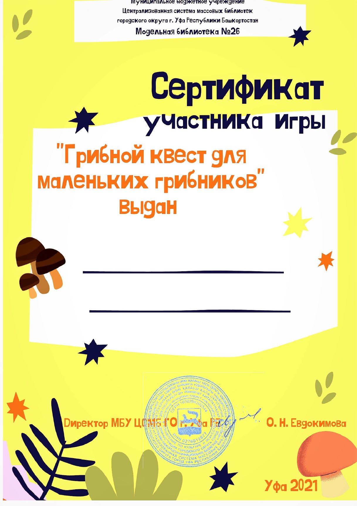 Наступила осенняя грибная пора - самое время вместе с взрослыми совершить прогулку в лес и заняться «тихой охотой». Чтобы закрепить знания детей о съедобных и несъедобных грибах предлагаем Вам принять участие в онлайн-квесте "Грибной квест для маленьких грибников" Квест будет доступен на официальном сайте Модельной библиотеки №26 МБУ ЦСМБ ГО г. Уфа РБ https://26.ufa-lib.ru/ с 23 сентября по 5 октября 2021 г. Для участия в квесте необходимо выполнить задания онлайн-квеста и выслать полученную кодовую фразу по ссылке https://26.ufa-lib.ru/online-otvety Участникам, успешно прошедшим квест, на указанную электронную почту будет разослана ссылка для скачивания Сертификата. Скачать сертификат ЗДЕСЬ