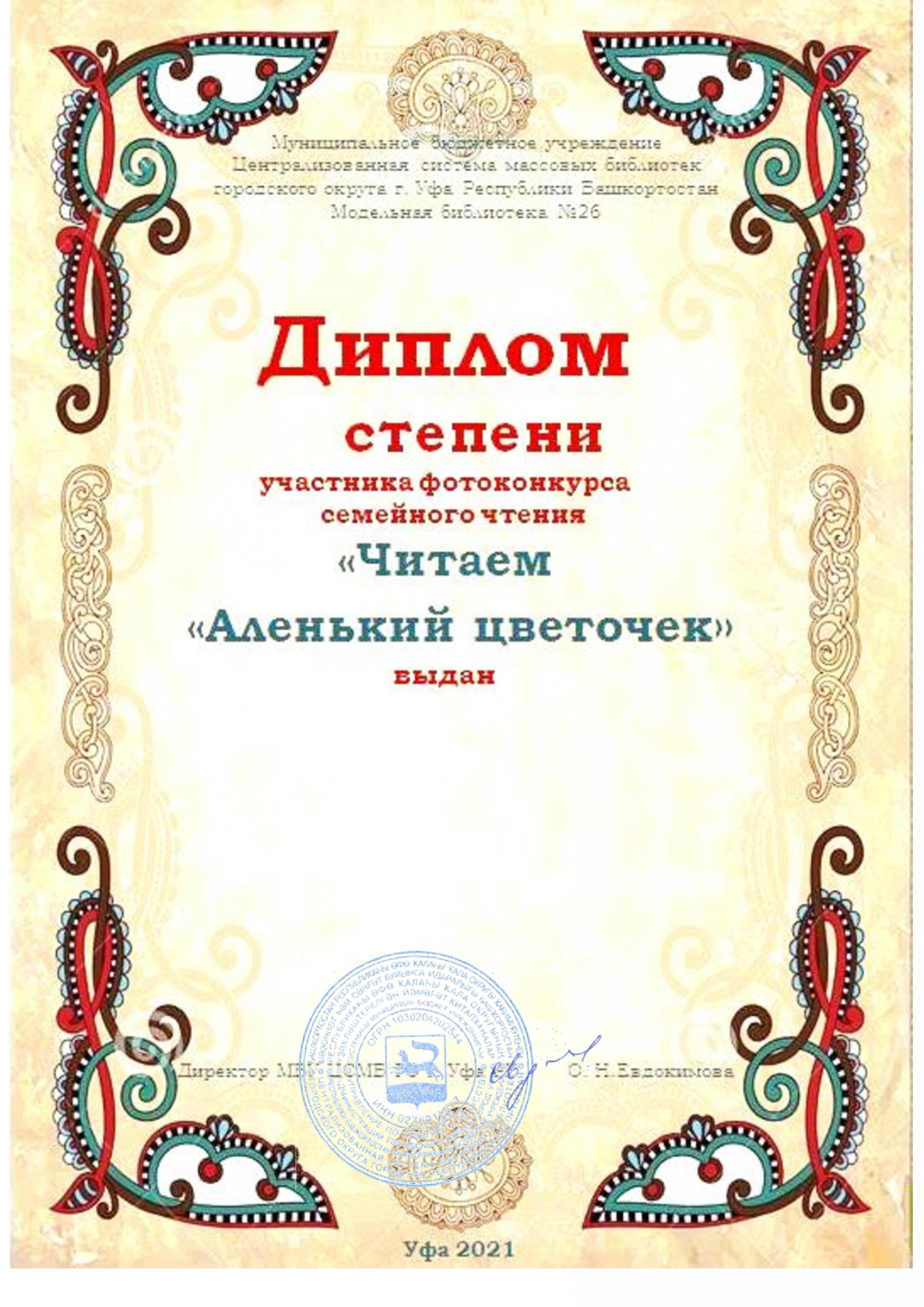 Итоги фотоконкурса «Читаем «Аленький цветочек».С 25 сентября по 25 октября 2021 года в Уфе проходил фотоконкурс «Читаем «Аленький цветочек». Организаторами конкурса выступила Модельная библиотека № 26 МБУ Централизованной системы массовых библиотек ГО г. Уфа РБ. Целями конкурса стали привлечение детей к систематическому чтению книг и укрепление положительного отношения подрастающего поколения к родному языку и литературе как к важнейшим духовным ценностям. Участие в конкурсе приняли 8 жителей не только Республики Башкортостан – города Уфа, а также со всей России - села Сылва Шалинского района Свердловской области, города Хабаровска, села Хасурта Республики Бурятия, Екатериновского района Саратовской области. По итогам on-line голосования, которое прошло на сайте Модельной библиотеки № 26 МБУ ЦСМБ ГО г. Уфа РБ были определены победители конкурса. Победителями фотоконкурса «Читаем Аленький цветочек» стали: 1 место – Улановский Вадим, город Хабаровск.2 место – Иждигатова Регина, город Уфа, Республика Башкортостан.3 место – Мухаметьянова Айлин, город Уфа, Республика Башкортостан.Итоги конкурса размещены на официальном сайте и странице в социальной сети ВКонтакте Модельной библиотеки № 26 МБУ ЦСМБ ГО г. Уфа РБ https://26.ufa-lib.ru и https://vk.com/biblio26_ufa Победители конкурса будут награждены электронными оригинальными именными дипломами. Все участники станут обладателями электронного сертификата, доступного для скачивания на официальном сайте Модельной библиотеки № 26 МБУ ЦСМБ ГО г. Уфа РБ https://26.ufa-lib.ru скачать сертификат здесь