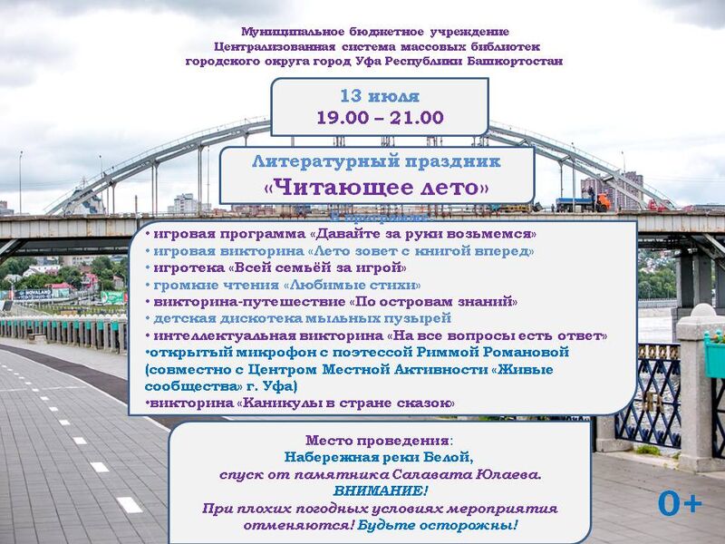 Литературный праздник «Читающее лето» на набережной реки Белой13 июля на набережной реки Белой (спуск от памятника Салавата Юлаева) состоится литературный праздник «Читающее лето». Библиотекари Централизованной системы массовых библиотек г. Уфы совместно с Центром местной активности «Живые сообщества» г. Уфа подготовили для уфимцев развлекательную программу. Дошкольники весело проведут время на Детской дискотеке мыльных пузырей. Младшие школьники проверят знания лучших сказок мира в викторине «Сладкое дерево». Уфимские семьи замечательно проведут время посетив игротеку «Всей семьёй за игрой» и став участниками игровой программы «Давайте за руки возьмёмся». Открытый микрофон будет ждать любителей поэзии для громкого чтения любимых стихотворений на самые разные темы. Откроет поэтический вечер поэтесса Римма Романова. Интеллектуальная викторина «На все вопросы есть ответ», игровая викторина «Лето зовет с книгой вперед», викторина-путешествие «По островам знаний» помогут посетителям Культурной набережной вспомнить прочитанные книги и узнать новую информацию о мировой литературе и не только. Библиотекари Централизованной системы массовых библиотек города Уфы ждут настоящих и потенциальных читателей на набережной реки Белой с 19:00 до 21:00 часов. Приходите! Будет интересно, познавательно и весело! |