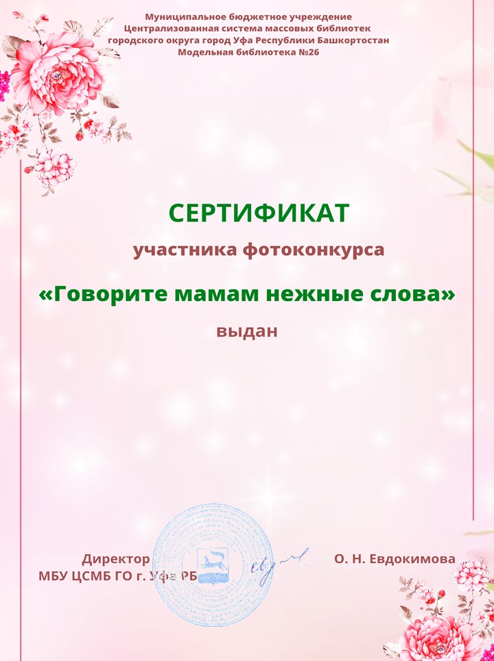 Подведение итогов фотоконкурса«Говорите мамам нежные слова».Фотоконкурс проходил с 25 октября по 26 ноября. Его организатором выступила Модельная библиотека №26 МБУ Централизованной системы массовых библиотек ГО г. Уфа РБ. Участниками конкурса стали 67 жителей не только Уфы, Башкортостана, но и всей России. Конкурс прошел в 2 этапа - прием заявок и работ и голосование. Сегодня мы подводим итоги конкурса и объявляем его победителей. Победителями фотоконкурса «Говорите мамам нежные слова» стали: 1 место - Шайхулова Амалия, МАОУ "Центр образования 29" г.Уфа Республики Башкортостан; 2 место - Суркова Алиса, МКДОУ Порошинский д/с №12; 3 место - Черных Михаил, МБДОУ №111 г. Ростов-на-Дону. Победители конкурса будут награждены электронными оригинальными именными дипломами.