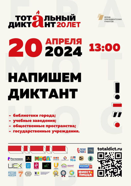 В Уфе акция пройдет уже в 13 раз. Каждый желающий может прийти, написать диктант и проверить уровень своей грамотности. Традиционно площадками Тотального диктанта станут библиотеки Централизованной системы массовых библиотек ГО г. Уфа РБ. Начало в 13.00 часов.