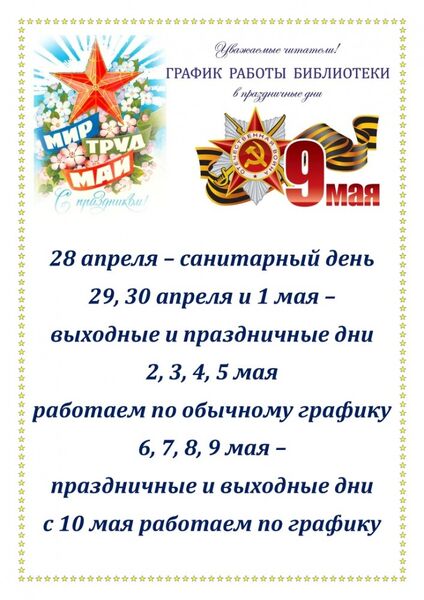 Обращаем ваше внимание на изменение графика работы библиотеки в праздничные дни, посвященные Дню Весны и Труда и Дню Победы 9 Мая.
